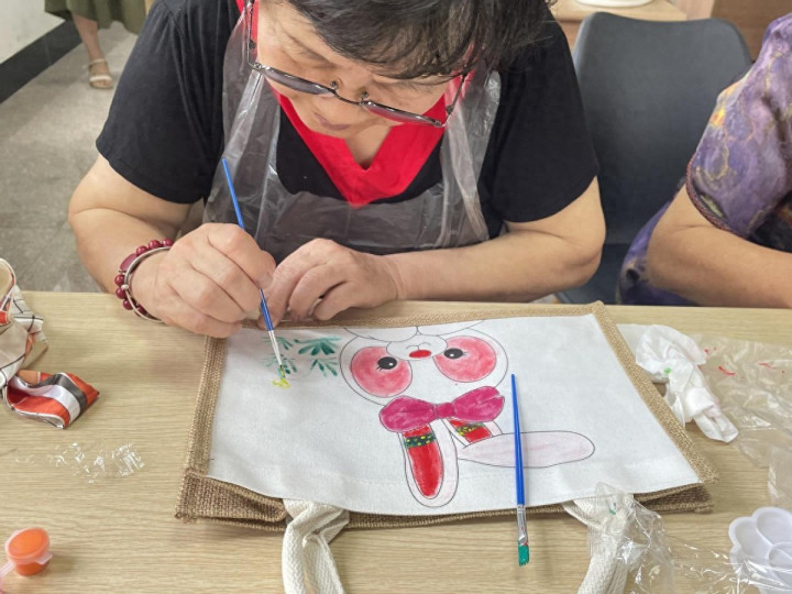 活动现场气氛热烈,居民们在专业指导下踊跃参与帆布包绘制,展现创意,发挥创造力。社工为居民准备并分发加厚棉麻帆布包、环保纺织颜料、画笔和多样模板等材料,提供植物、动物、文字等多种简易模板参考,详细讲解绘画技巧与注意事项,鼓励居民们发挥想象自由创作。居民们在绘画中大胆构思,绘制出一幅幅充满生机、各具特色的画作,展现了居民们独特的审美和积极向上的生活态度。参与者纷纷表示,亲手制作独一无二的帆布包既实用又有意义,能够在日常生活中持续传递环保与美学的双重价值。